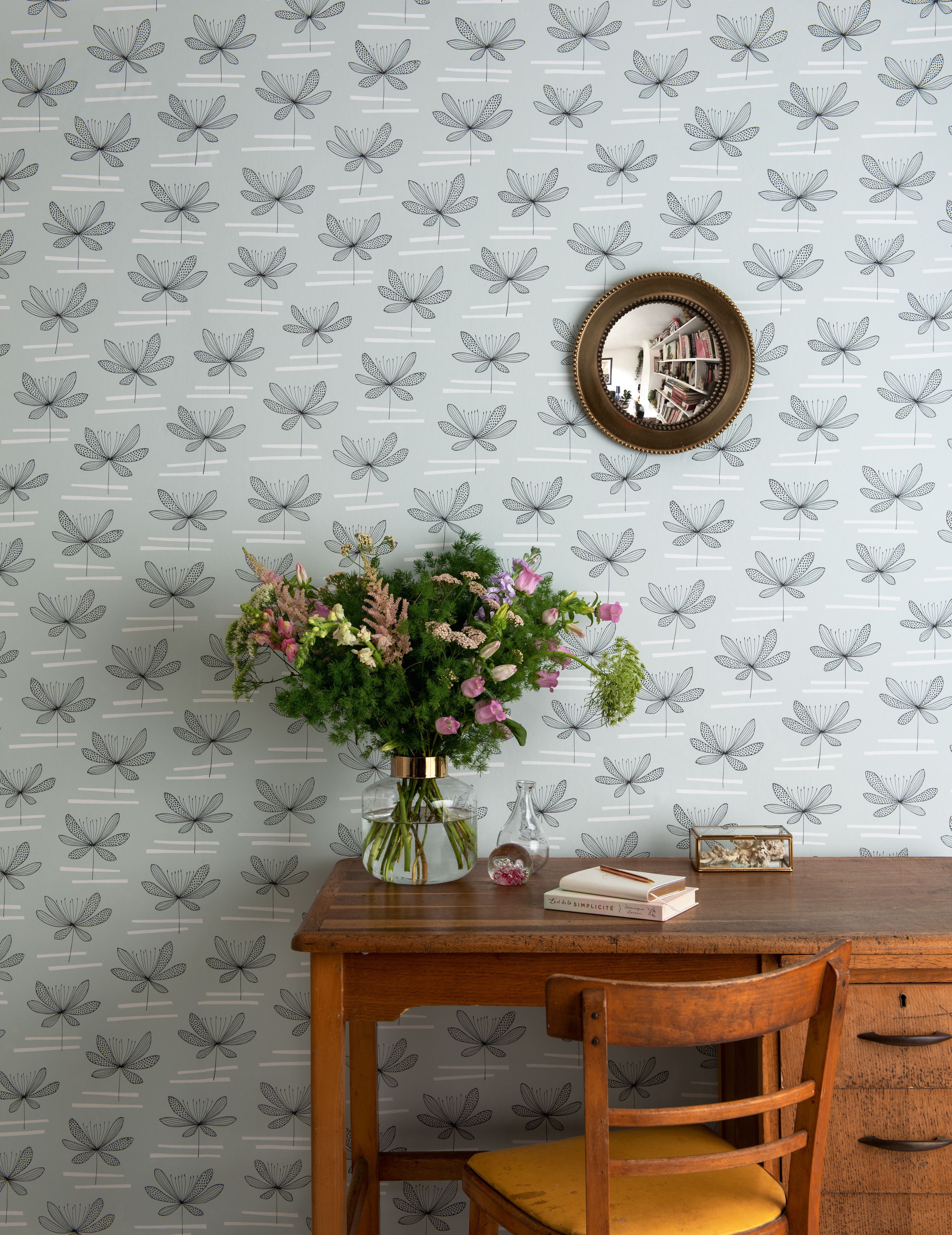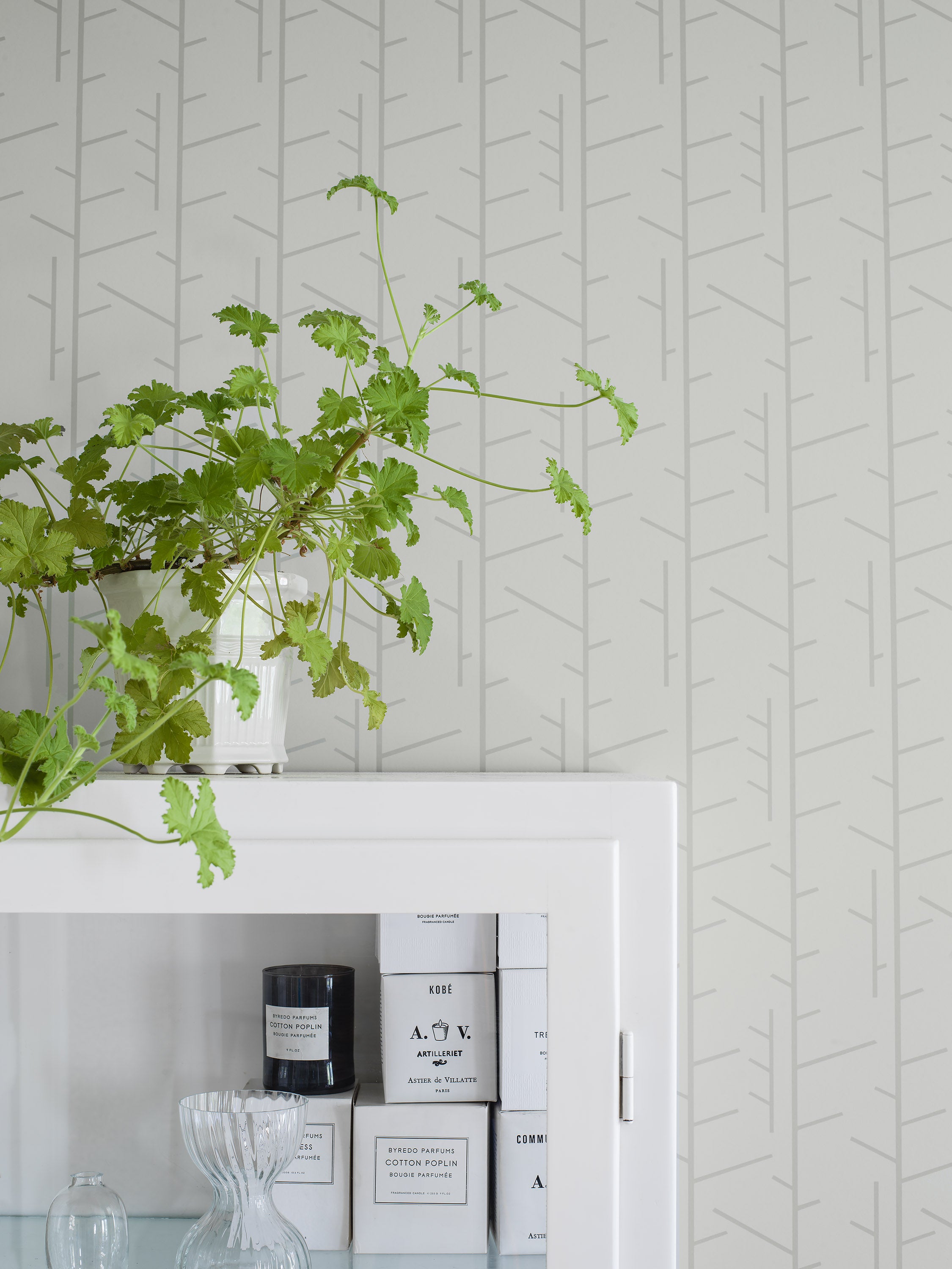 Tapeter som kan benämnas lätt strama, ibland mönstrade med retrotankar. Kulörer är vita och ljusa varmgråa toner till grafitgrått. Mattor kan vara grafiska maroccanska i svartvitt, ryamattor eller slitna vintagemattor. Kombinera med svartvit fotokonst och glas eller keramik - gärna från 1950- och 1960-talet.